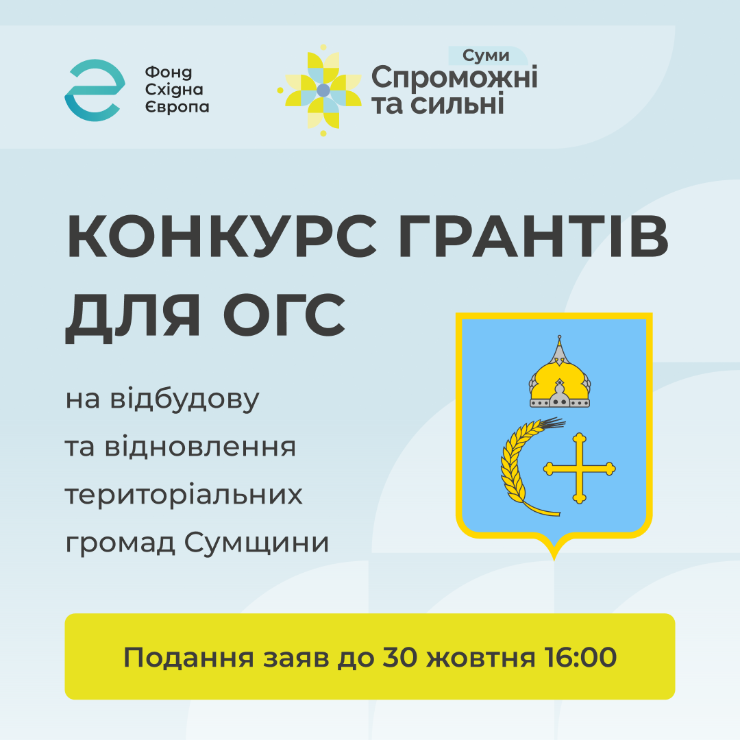 Фонд Східна Європа оголошує конкурс грантів у межах проєкту «Спроможні та сильні: Суми» (далі – Конкурс) та запрошує до участі організації громадянського суспільства (ОГС). Мета конкурсу – підтримка проєктів ОГС у сферах охорони здоров’я, освіти, житла / укриттів (зокрема їх ремонтів) у територіальних громадах Сумської області, постраждалих від війни. Податися можна лише через Грантовий портал Фонду.