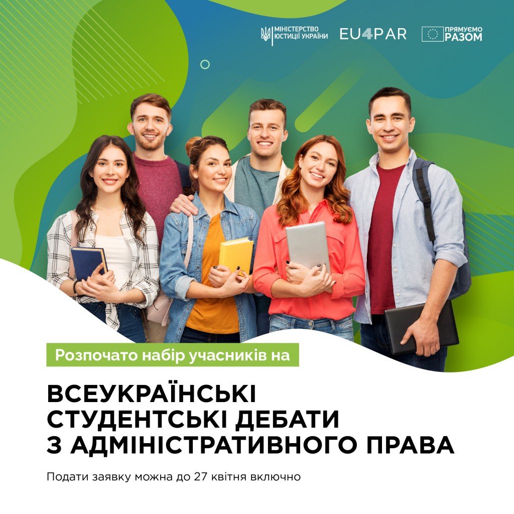 Запрошуємо студентів-правників взяти участь у Всеукраїнських студентських дебатах із адміністративного права. Захід ініційований Проєктом ЄС «Продовження підтримки комплексної реформи державного управління в Україні» (EU4PAR) за підтримки Міністерства юстиції України. Під час дебатів студенти отримають можливість застосувати теоретичні знання з адміністративного права на практиці, розвинути аналітичне мислення та ораторську майстерність, а також поглибити розуміння адміністративної процедури.