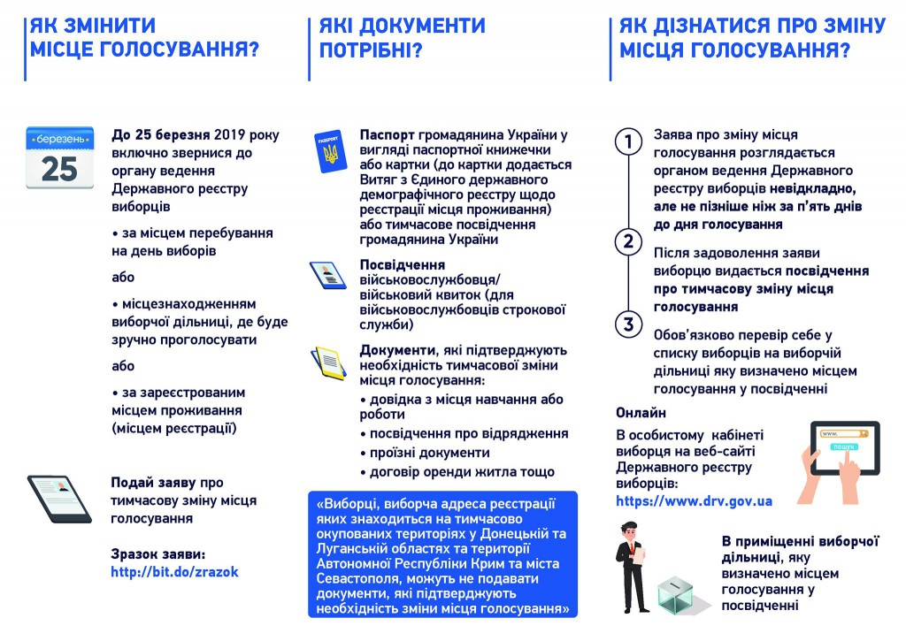 Увага! Виборці, виборча адреса яких знаходиться на тимчасово окупованих територіях Донецької та Луганської областях; на території Автономної Республіки Крим та міста Севастополя, можуть не подавати документи, які підтверджують необхідність зміни місця голосування.
