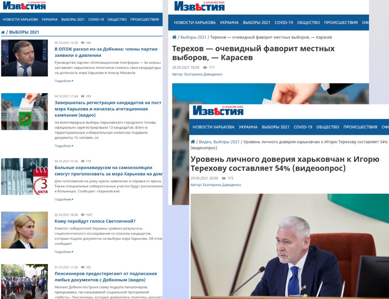 Під рубрикою «Выборы 2021» на сайті цього ЗМІ з початку виборчого процесу – до 5 жовтня опубліковано 9 статей, які містять позитивно-оціночні судження про Терехова та його виборчі перспективи. 13 статей – негативно спрямовані щодо інших політиків: 9 – проти кандидата Михайла Добкіна, і 4 – проти народного депутата Юлії Світличної (хоча вона не балотується і не озвучувала такого наміру).
