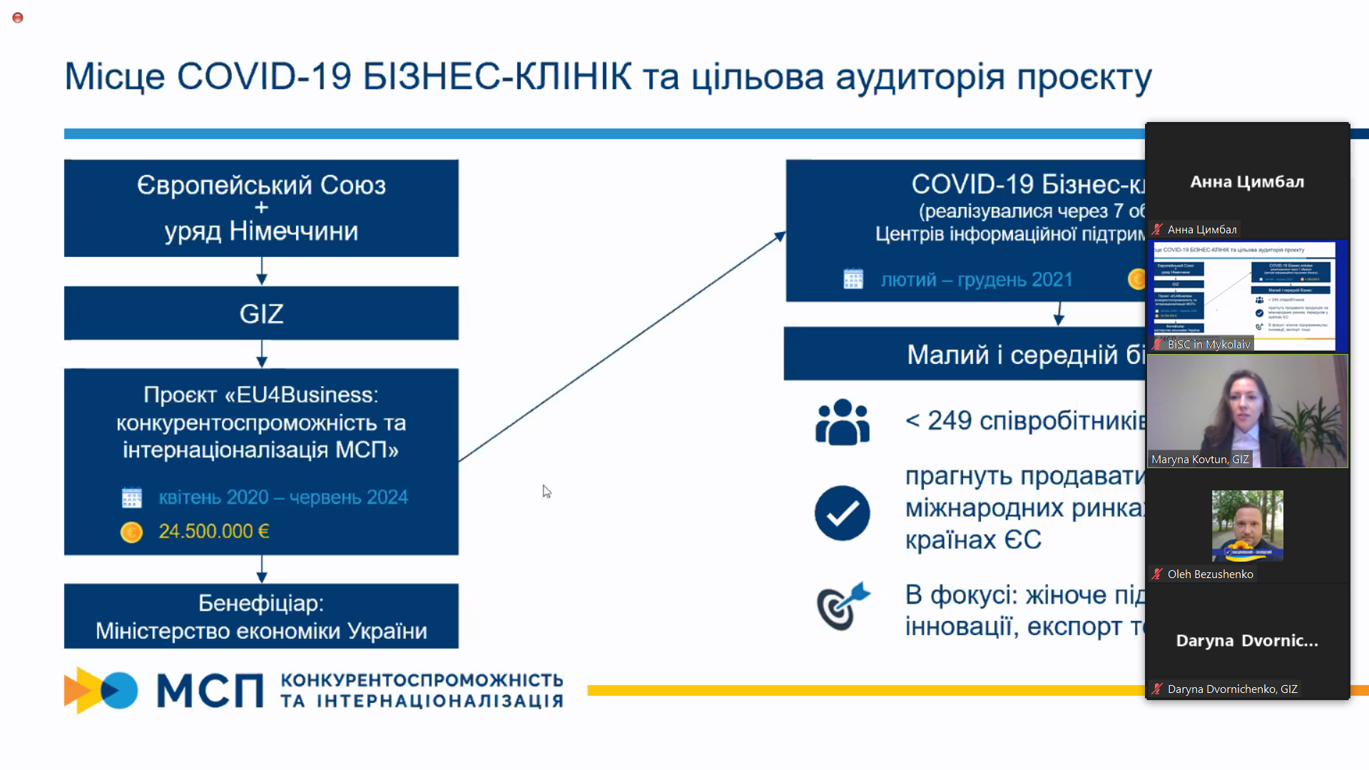 Захід організований Центром Підтримки Бізнесу в рамках ініціативи COVID-19 БІЗНЕС-КЛІНІКИ проєкту «EU4Business: конкурентоспроможність та інтернаціоналізація МСП», що спільно фінансується Європейським Союзом та урядом Німеччини, і реалізується німецькою федеральною компанією Deutsche Gesellschaft für Internationale Zusammenarbeit (GIZ) GmbH. Мета проєкту – створення кращих умов для розвитку українських малих і середніх підприємств, підтримка інновацій та стимулювання експорту, що є шляхом до сталого й рівномірного економічного зростання. У межах підходу Team Europe проєкт також сприятиме відновленню України від наслідків COVID-19.
