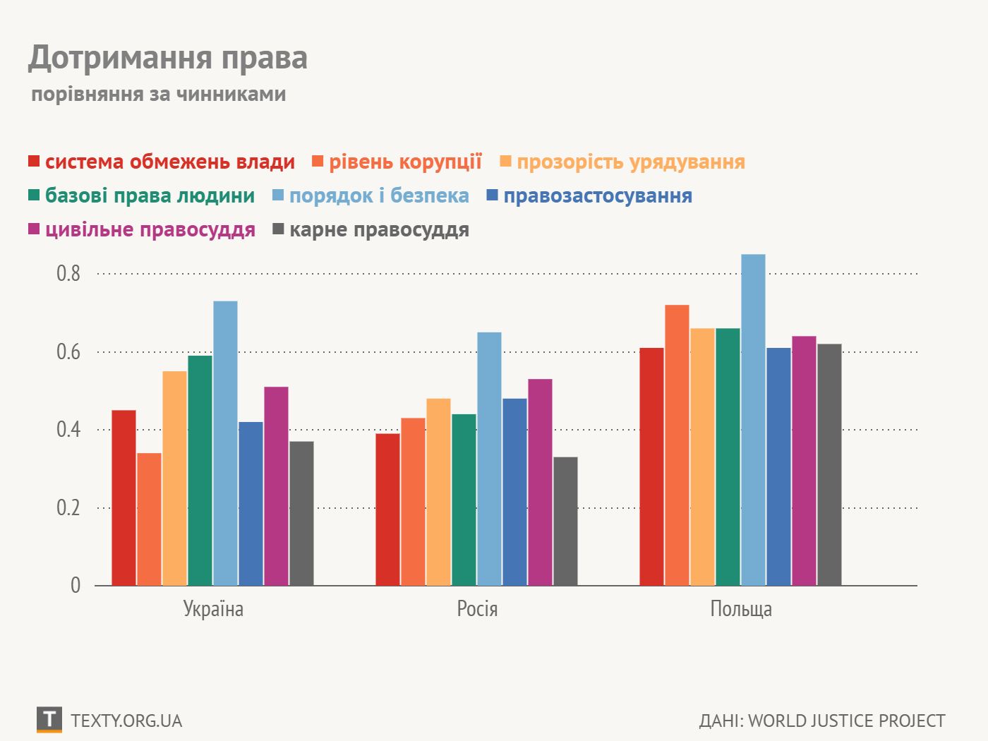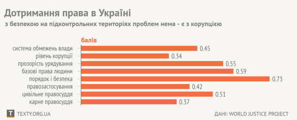 1 означає повне дотримання закону, 0 – повне беззаконня. Рахується середнє арифметичне за кожним із чинників.