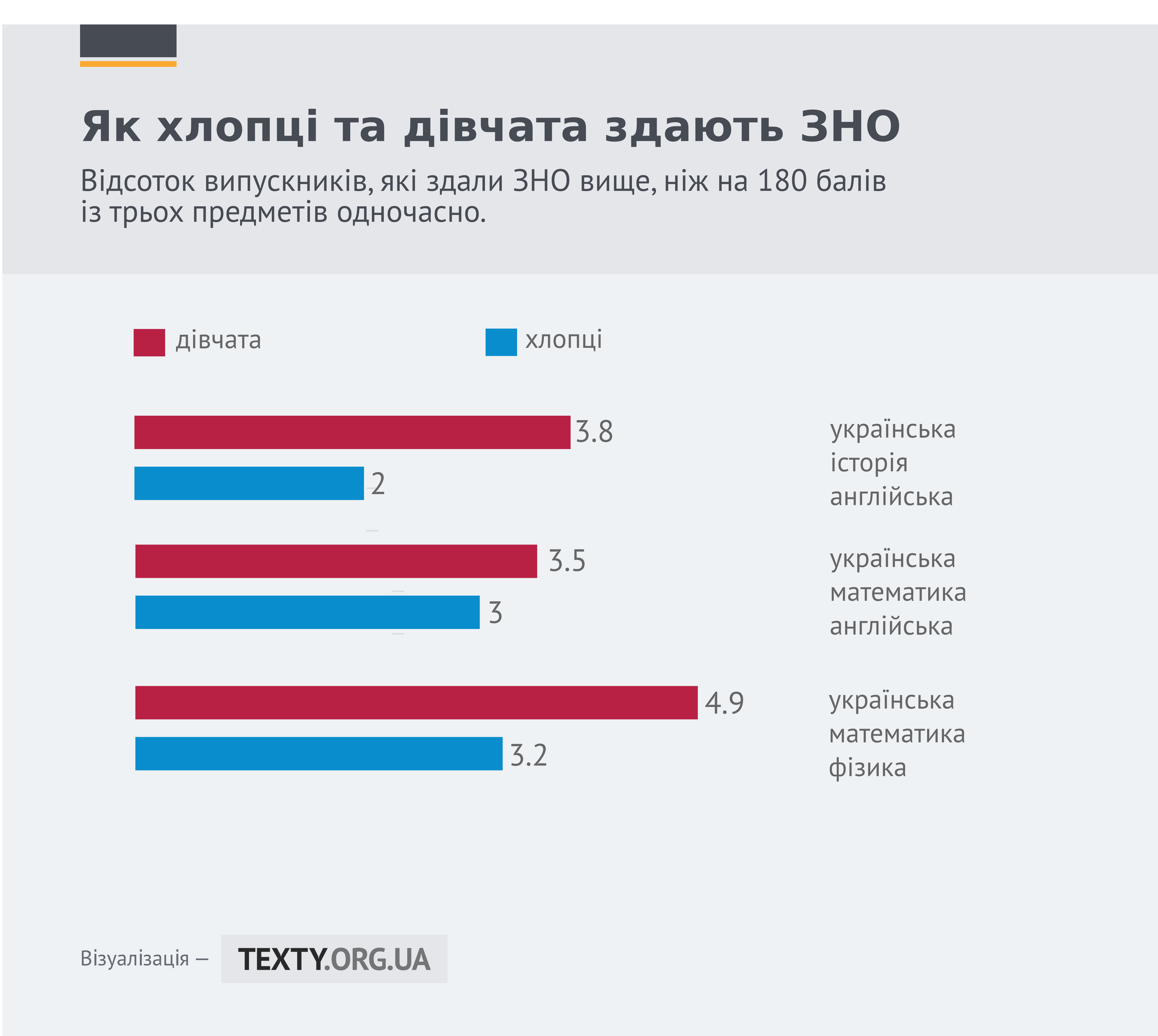 Оцінювання з української мови проходять усі учні, оцінювання з інших предметів здають ті хто планує продовжити навчання у вишах. ТЕКСТИ вибрали усіх випускників, котрі здали ЗНО на більше ніж 180 балів з трьох предметів одночасно. Загалом, максимально можливий бал 200. Предмети поділено на 3 класичні блоки спеціальностей (гуманітарний, математичний, фізичний). Кількість найкращих учнів показали пропорційно кількості усіх, хто здавав ЗНО.