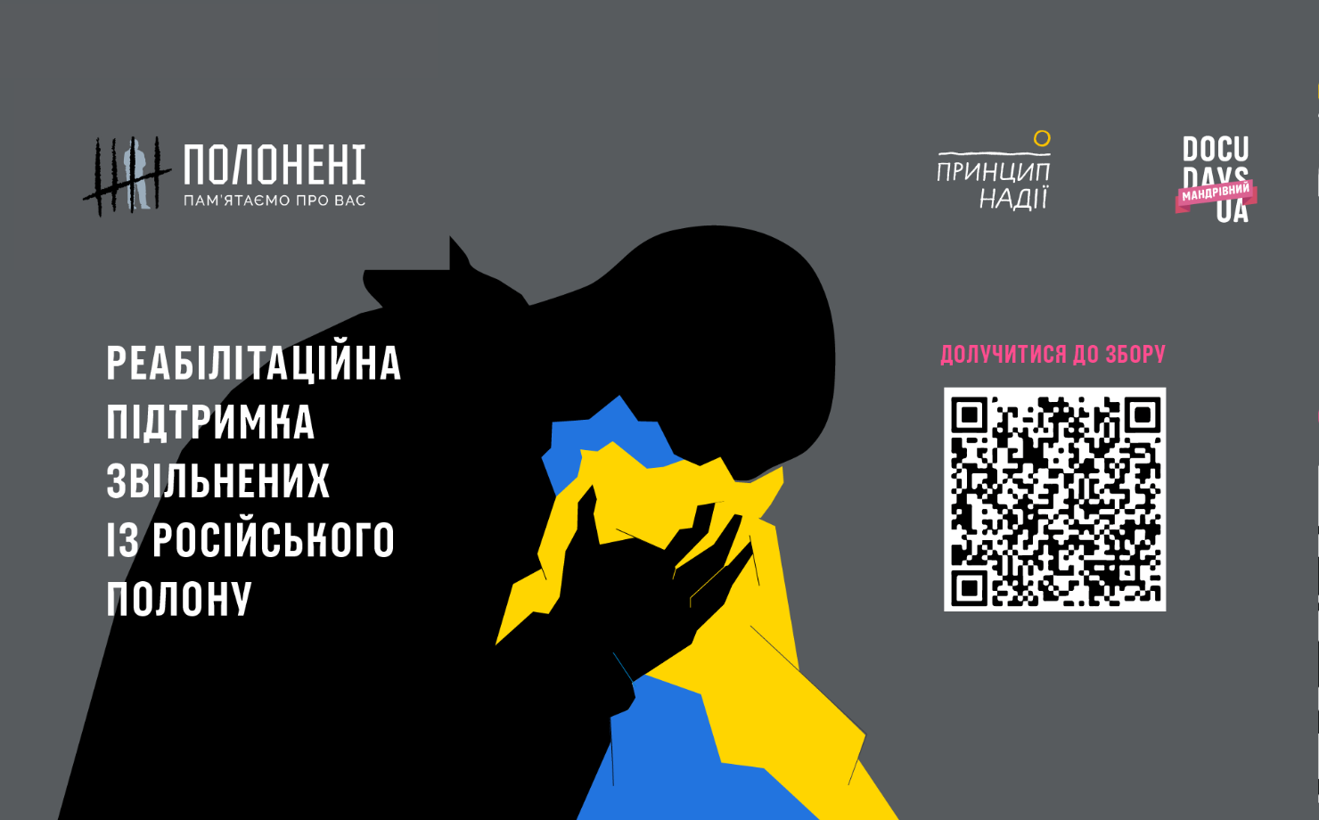 Щоб допомогти звільненим пройти шлях реабілітації, Мандрівний Docudays UA разом із БФ «Принцип надії» ініціювали благодійний збір коштів. Фонд створений правозахисником, журналістом, ветераном з досвідом полону й амбасадором Мандрівного Максимом Буткевичем. Підтримати його можна за QR-кодом або за прямим посиланням на спеціальний рахунок.
