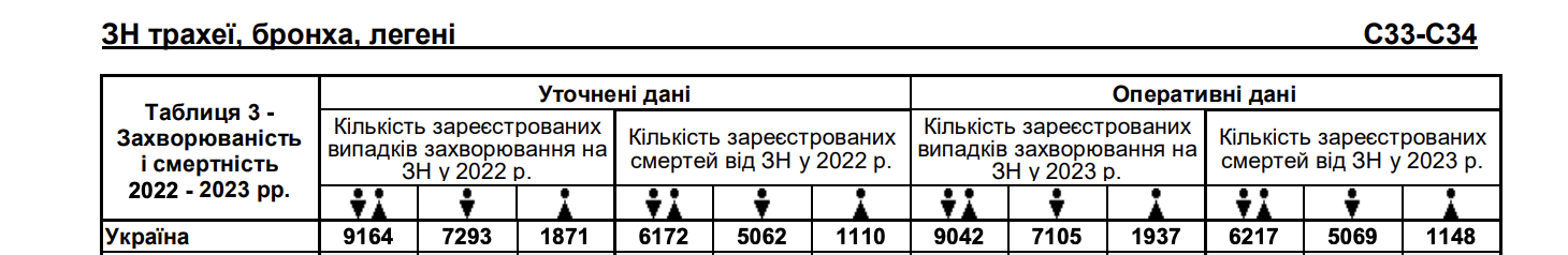 В Україні станом на 2023 рік зафіксовано 1 153 519 хворих на рак, з них 110 022 людей захворіли у 2023 році та 42 043 померли. Рак трахеї, бронха, легені – на третьому місці за поширеністю та на першому за смертністю. У 2023 році було зафіксовано 9 042 випадків: 7 105 серед чоловіків та 1 937 серед жінок. Померли від цього виду онкології 5 069 чоловіків та 1 148 жінок.