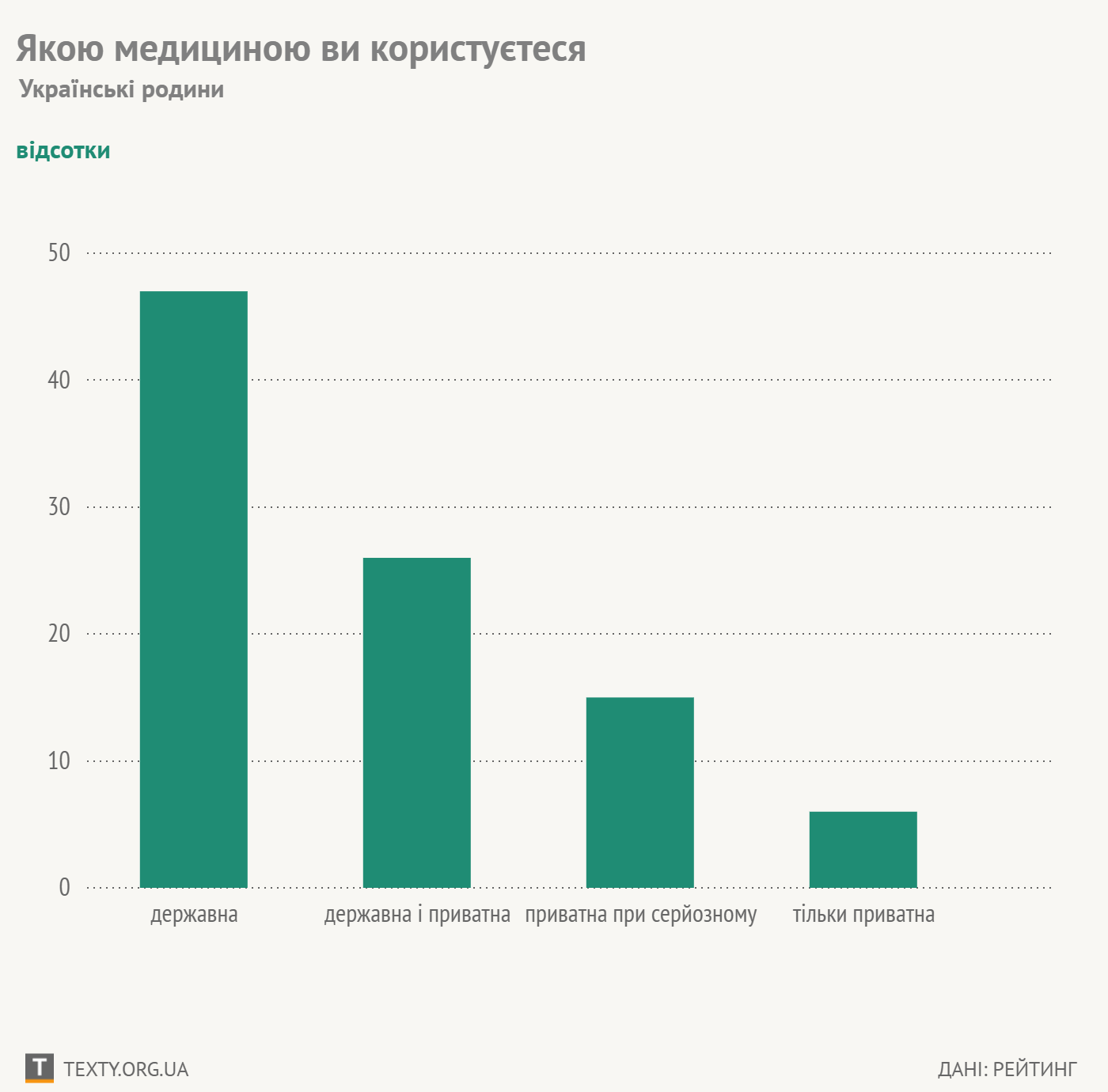 За результатами опитування, проведеного Соціологічною групою «Рейтинг» у жовтні 2016 року, 47% опитаних заявили, що користуються лише послугами державних медичних установ. 26% сказали, що окрім послуг державних медичних установ звертаються за умови наявності додаткових коштів в сім’ї до приватної медицини. 15% заявили, що поруч із державними послугами звертаються до приватних закладів у випадку серйозної хвороби в сім’ї. Лише 6% надають перевагу переважно приватним медичним установам перед державними.
