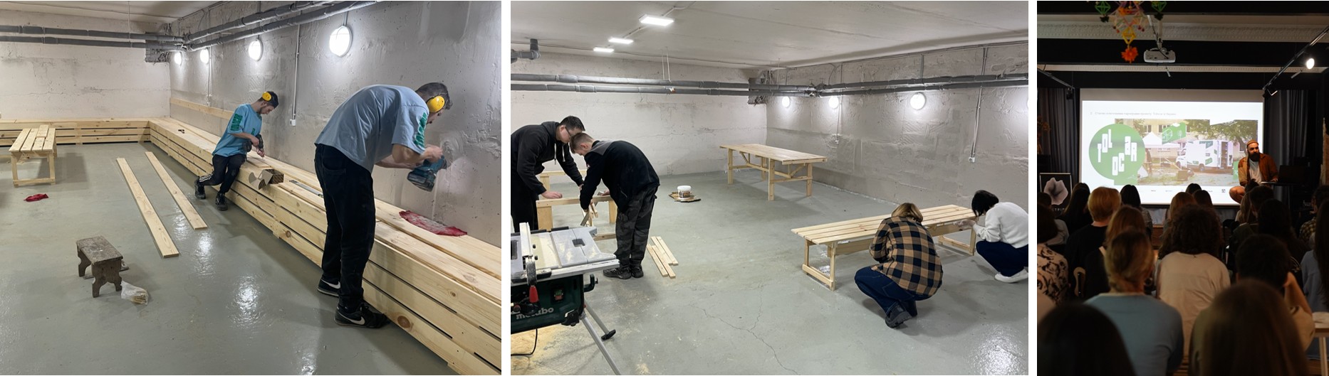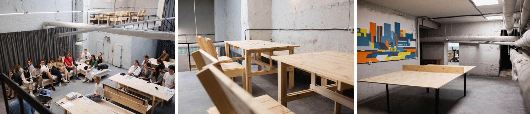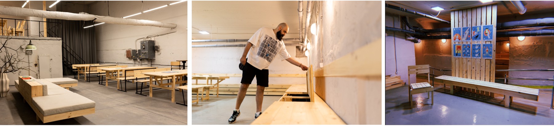 Ще один університетський простір — укриття архітектурного факультету КНУБА — був реалізований швидко завдяки вже напрацьованим рішенням. Великі столи та лави, створені за розробленими схемами, дали змогу використовувати простір для групової роботи й занять, а стримане оформлення сформувало спокійну та комфортну атмосферу.