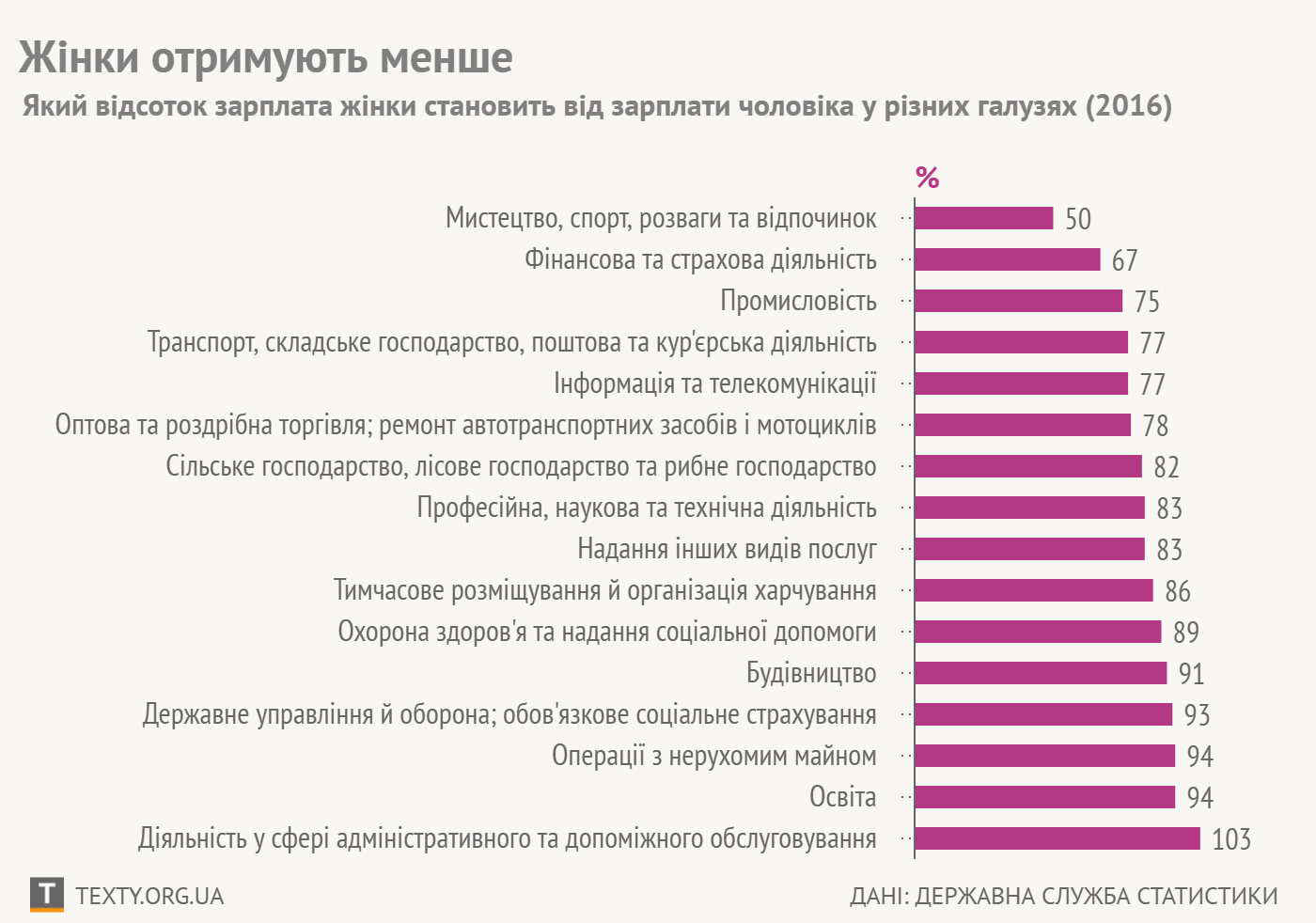 За даними Державної служби статистики, жінки в Україні отримують на 25% нижчу зарплату, у порівнянні з чоловіками. Найбільший розрив у заробітній платні у 2016 році був у сфері мистецтва, спорту, ...