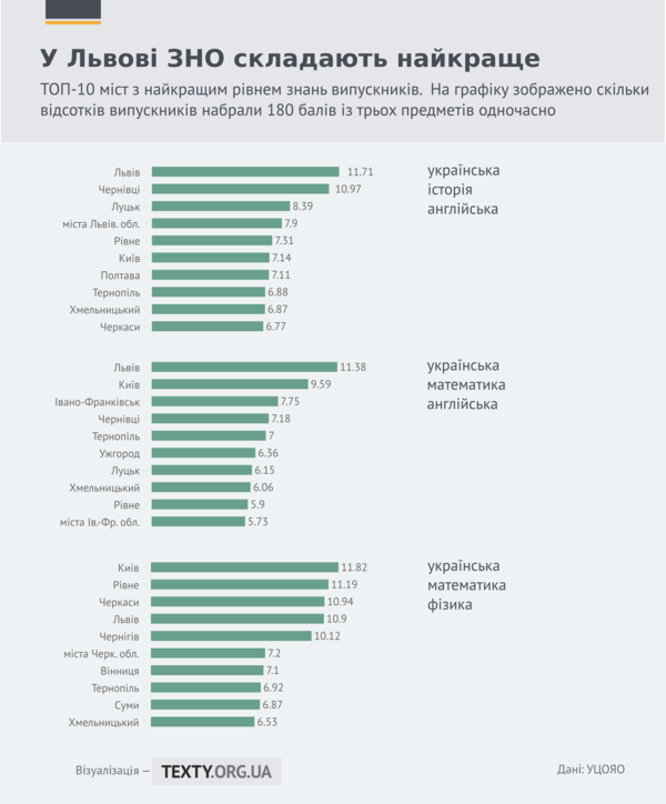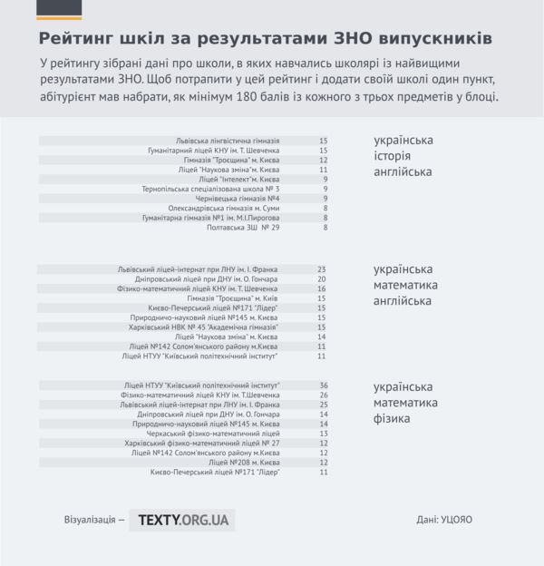 Оцінювання з української мови проходять усі учні, оцінювання з інших предметів здають ті хто планує продовжити навчання у вишах. ТЕКСТИ вибрали усіх випускників, котрі здали ЗНО на більше ніж 180 балів з трьох предметів одночасно. Загалом, максимально можливий бал 200. Предмети поділено на 3 класичні блоки спеціальностей (гуманітарний, математичний, фізичний). Кількість найкращих учнів показали пропорційно кількості усіх, хто здавав ЗНО.