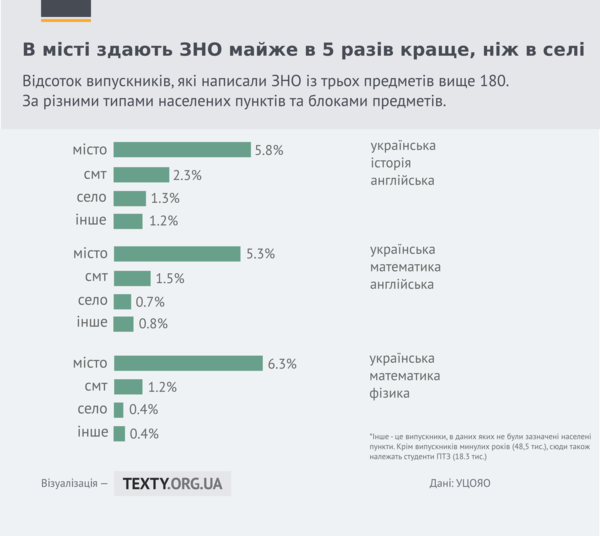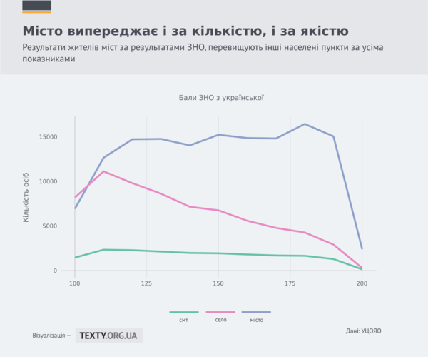 «Я зарахував до сільської місцевості, крім сіл, також смт, але результати все одно сумні. Серед учасників із села в 1,5-2 рази вищий відсоток тих, хто не набрав навіть мінімальний прохідний бал. Аж 20% зареєстрованих провалили тести з математики та англійської. Серед тих, кому вдалось скласти тест, оцінки все одно суттєво нижчі: міський житель в середньому отримав на 12 балів більше з української, математики та англійської.»