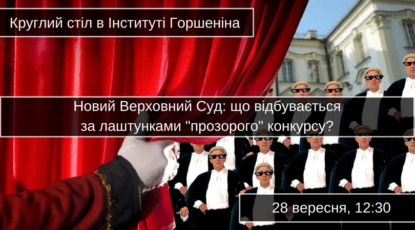28 вересня о 12:30 в межах інформаційного партнерства сайту LB.ua та Реанімаційного Пакету Реформ в прес-центрі Інституту Горшеніна (м. Київ, вул. Мала Житомирська, 18б) відбудеться круглий стіл на тему “Новий Верховний Суд: що відбувається за лаштунками “прозорого” конкурсу?”