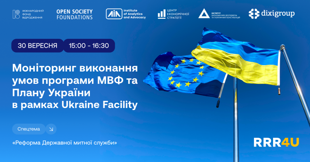 30 вересня о 15:00 запрошуємо Вас на презентацію нового випуску Моніторингу виконання умов програми МВФ та допомоги ЄС у межах Ukraine Facility від консорціуму RRR4U, який враховує підсумки реалізації зобов’язань станом на кінець вересня 2024 року. Додатково захід містить спеціальну тему, присвячену реформі Державної митної служби.
