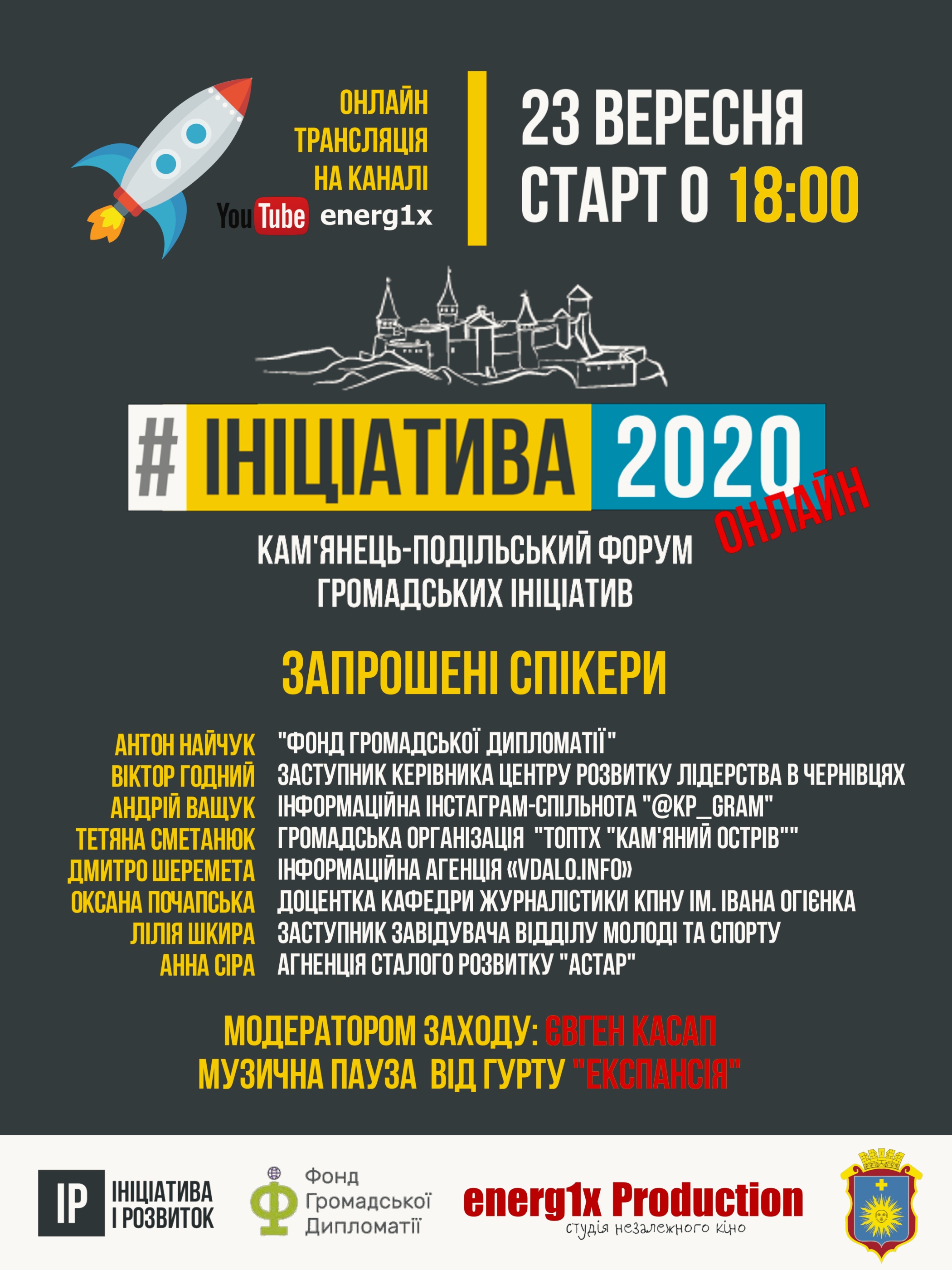 #Ініціатива’2020 – VIII-ий щорічний форум Кам’янець-Подільських ініціатив і проектів, який організовується Андрієм Зайцем з 2013 року, на якому представники місцевих громадських організацій та молодь презентують свою діяльність, виступають на різні актуальні теми, а запрошені спікери та відомі активісти проводять лекції і воркшопи.