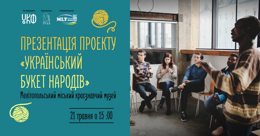 У вівторок, 21 травня 2019 року в Мелітополі відбудеться презентація проекту “Український Букет Народів – створення Інтеркультурних путівників з залученням громадян України різного соціального та етнічного походження”. Проект реалізовує Молодіжна організація “СТАН” за підтримки Українського культурного фонду в Мелітополі та ще в 3 громадах України (Лисичанськ, Кременчук та Дрогобич). Локальний партнер проекту Благодійна організація «Благодійний Фонд “MLT Museum PLUS” .