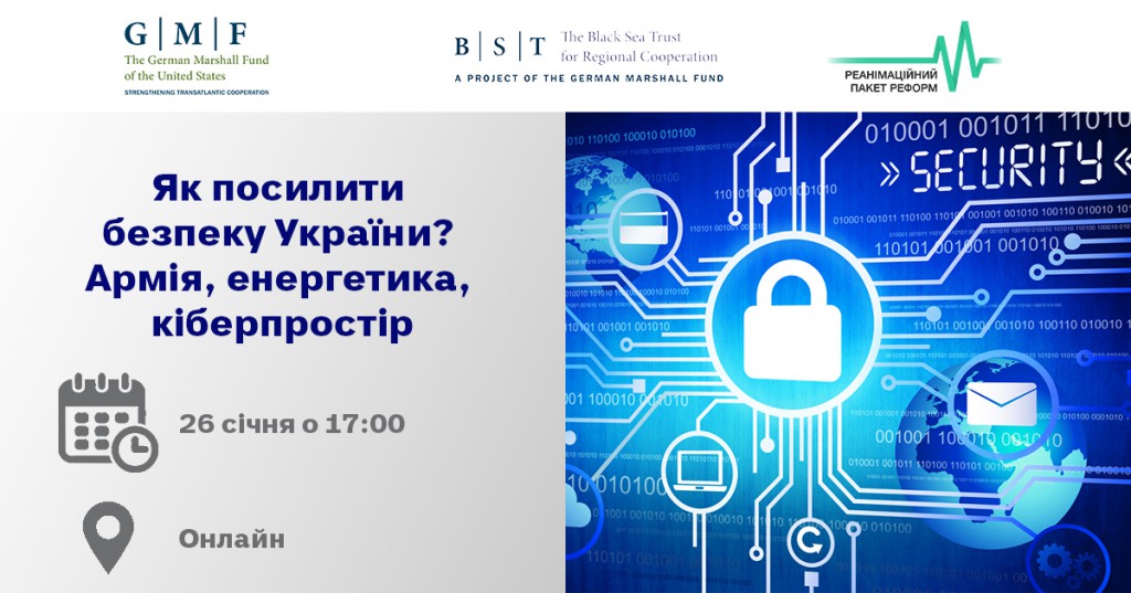 26 січня о 17:00 Коаліція Реанімаційний Пакет Реформ разом із Фондом Маршалла Сполучених Штатів (German Marshall Fund) організовують онлайн-круглий стіл Трансатлантичної робочої групи (Transatlantic Task Force on Ukraine) «Як посилити безпеку України? Армія, енергетика, кіберпростір».