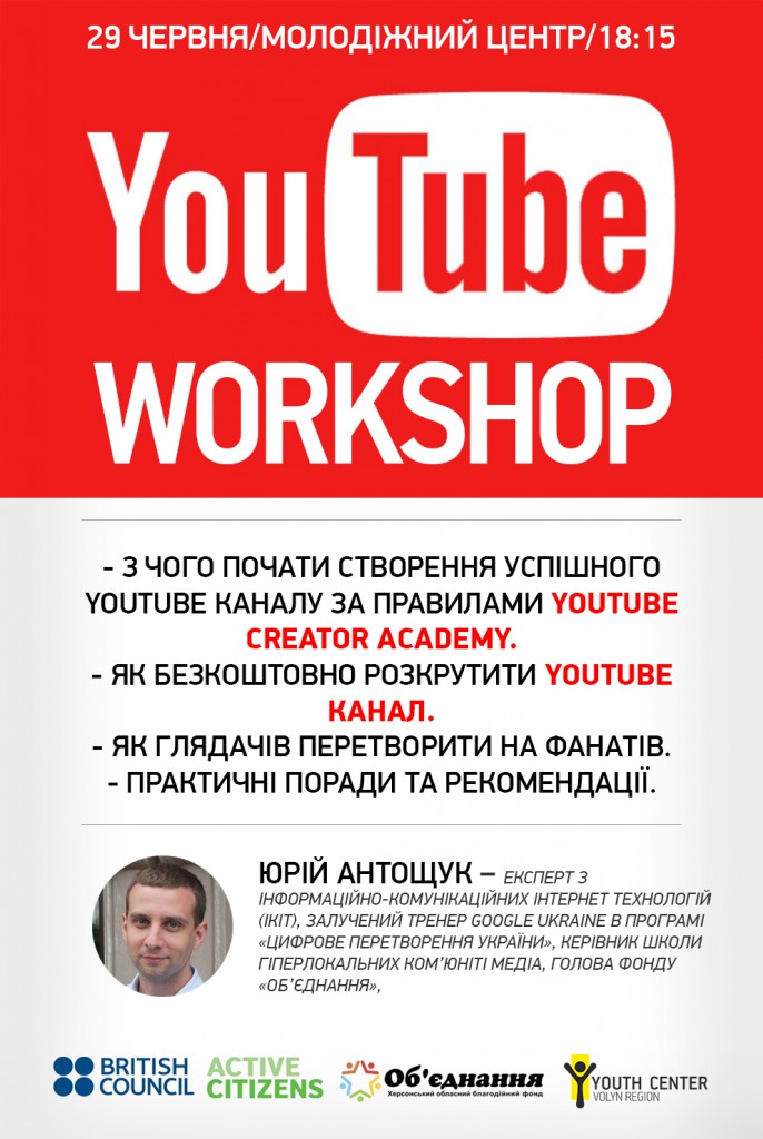 Для усіх зацікавлених, хто користується, чи планує користуватися соціальною мережею Youtube – організовується семінар-тренінг. Нагадаємо, що хостинг входить до трійки найбільш відвідуваних сайтів Інтернету. Користувачі можуть додавати, продивлятись і коментувати ті чи інші відеозаписи. Завдяки простоті та зручності використання, YouTube став одним із найпопулярніших місць для розміщення відеофайлів. Кожні 5 секунд на YouTube заливається 6 годин відеоконтенту. Аудиторія сайту більше мільярду чоловік. У США сервіс популярніший ніж будь який канал телебачення.